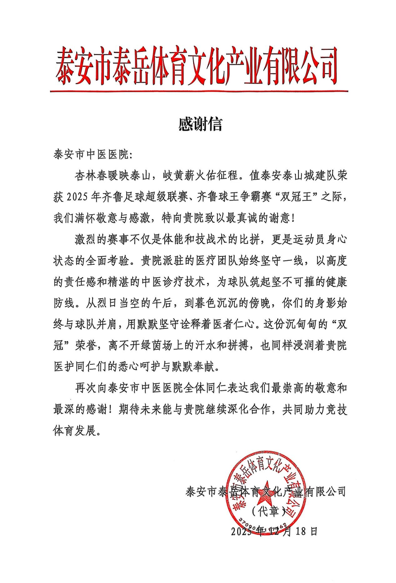 近来,2025年齐鲁足球超级联赛暨齐鲁球王争霸赛落下帷幕,泰安泰山城建足球队勇夺“双冠王”。赛后,泰安市泰岳体育文化产业有限公司特别向泰安市中医医院发来感谢信,对医院医疗团队的勤劳支付与专业支撑表明崇高敬意和衷心感谢。信中说到:“这份沉甸甸的‘双冠’荣誉,相同滋润着贵院医护同仁们的尽心呵护与静静奉献。”