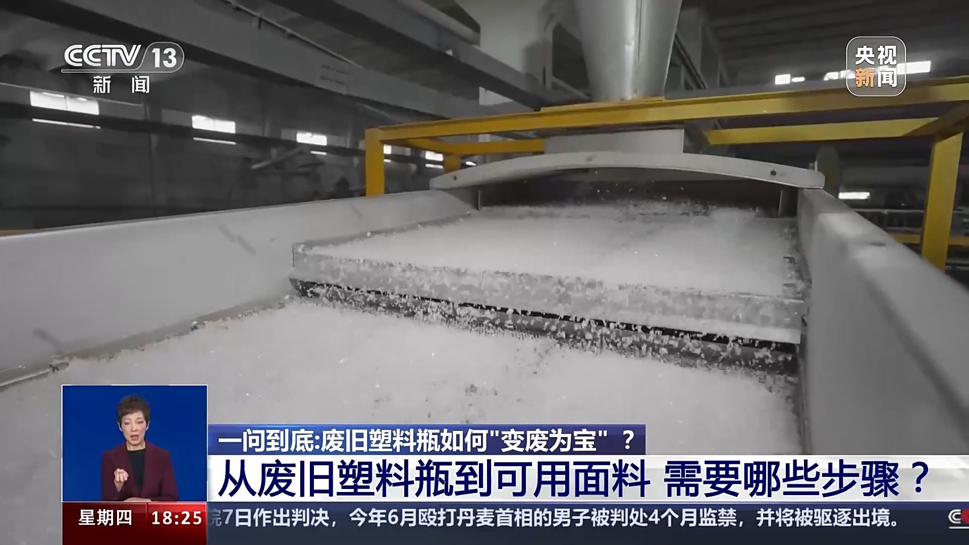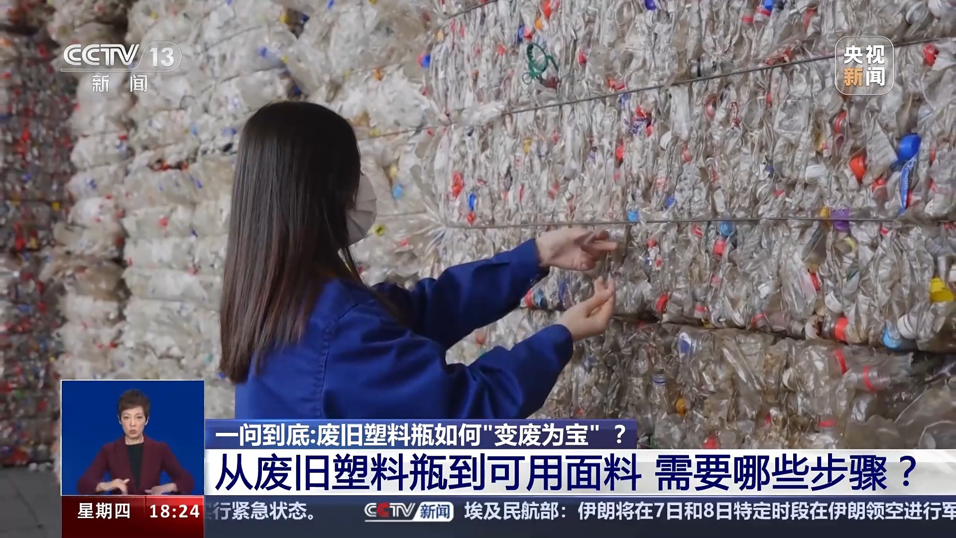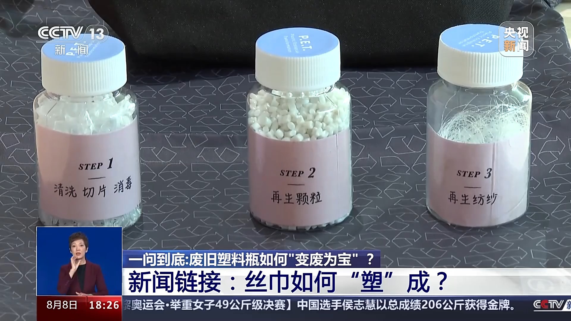中国再生资源回收利用协会再生塑料分会执行主任 周长赛:再生涤纶它的原材料是大家所熟知的PET(聚乙烯对苯二甲酸酯)瓶,就是大家常饮用的饮用水的瓶子为原料,通过破碎、清洗、拉丝(熔融纺丝等工序)做成了相应的纺织品,然后成了我们奥运健儿的服装的原材料。